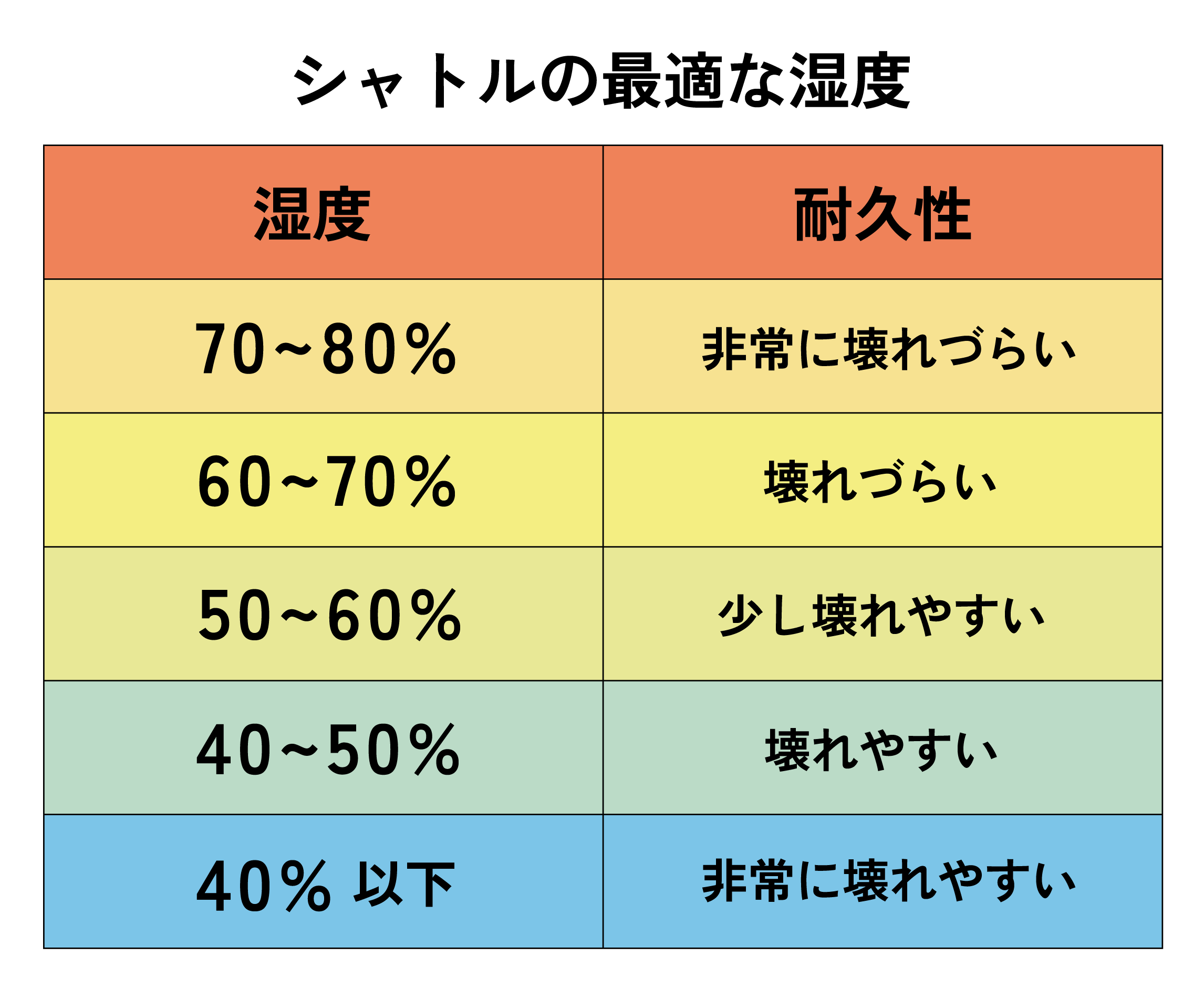 上のグラフを見る限り、全体的に湿度が60%以上あるのでシャトルは「壊れづらい」と思われるかもしれませんが、これは月の平均値を取ったものであり、1日1日で見ると湿度は大きく変動します。