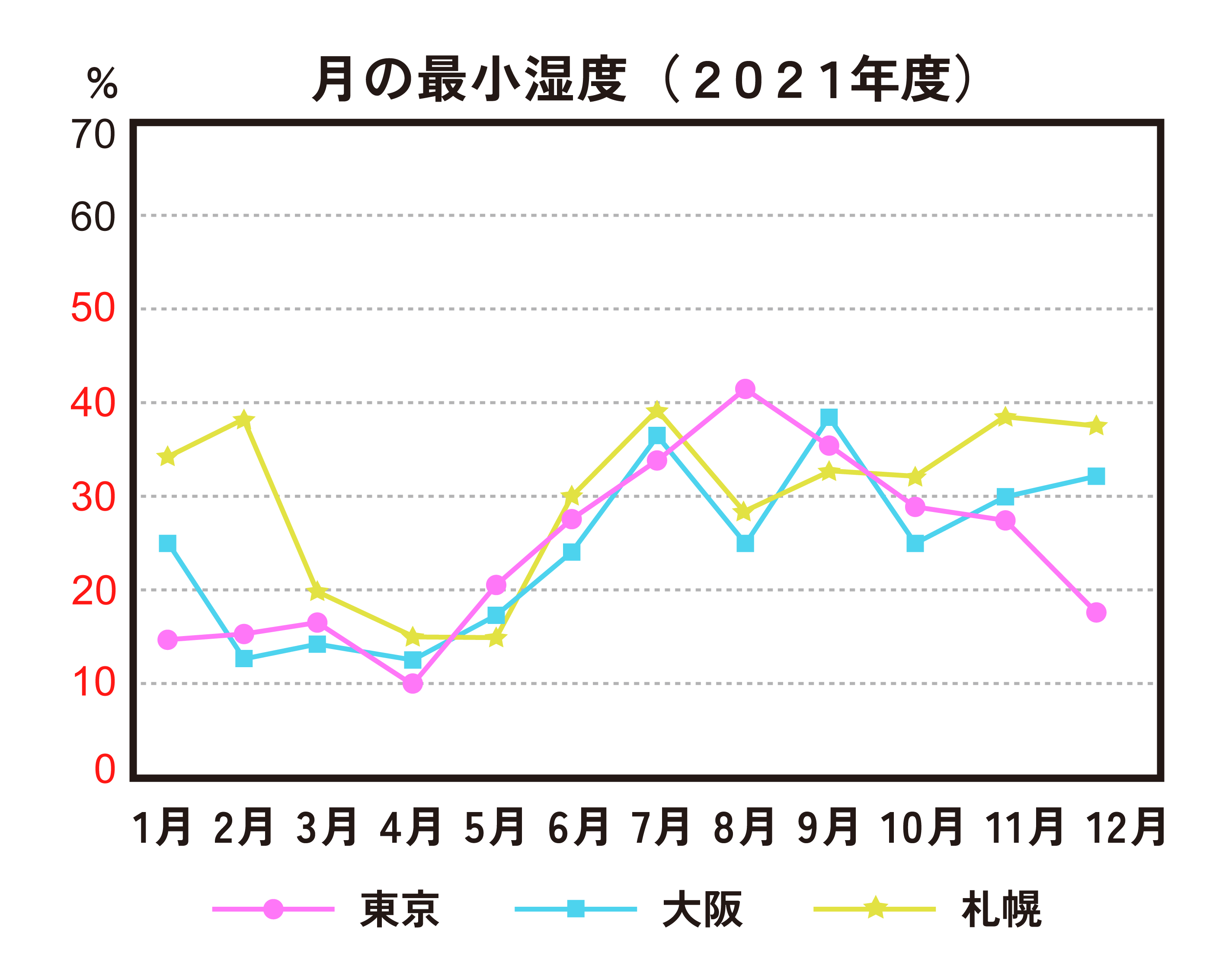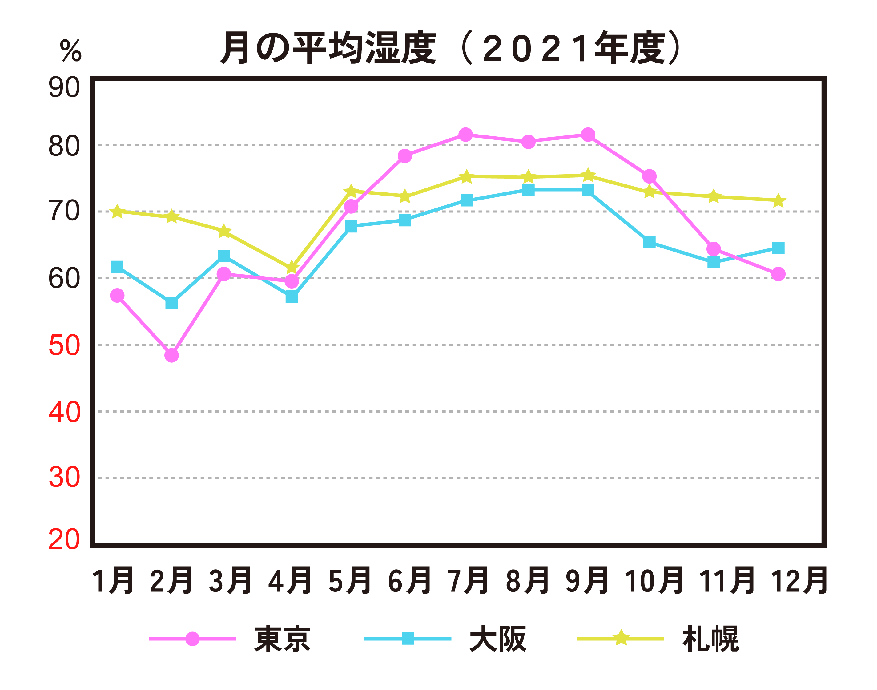 日本は世界的にも寒暖差の激しい特殊な気候の国です。夏は湿度が90%以上、冬は30%以下など振れ幅の大きい環境にあります。