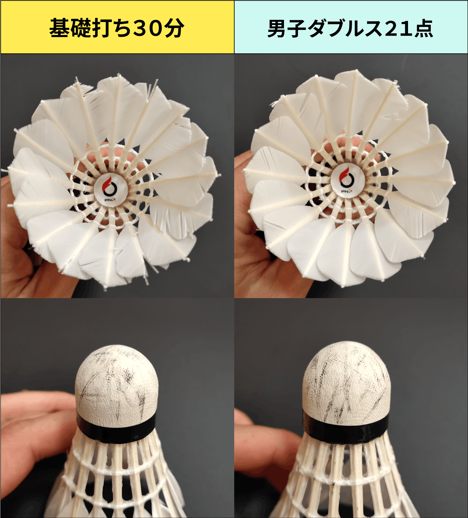 事前に「上がったら全部スマッシュでお願いします。」と伝えたB級男子ダブルス21点1ゲームにおいても壊れることはありませんでした。コルクが柔くなることもなく、張りがある状態を保持していました。