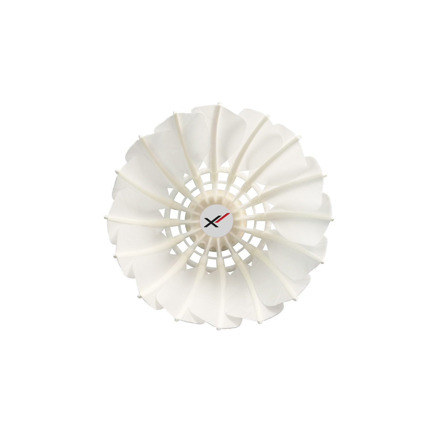 繰り返しのスマッシュや長いラリーでも羽根の軸部分に負荷がかかりにくく、従来の水鳥シャトルで起こりがちな軸折れの発生率を抑え、高い耐久性を実現しました。