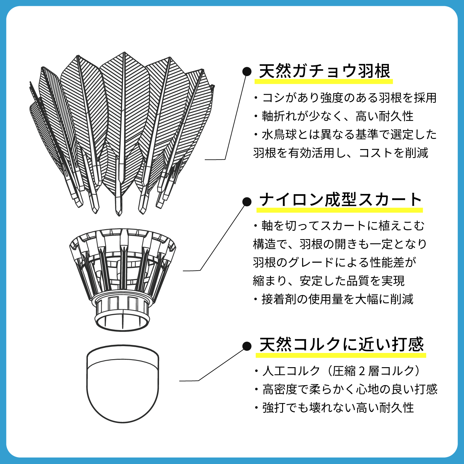 また、従来の水鳥球のように軸部分を大量の接着剤で固める必要がなく、シャトル全体の形状崩れを防ぎ、接着剤の使用量も大幅に削減され、環境にも優しいシャトルです。